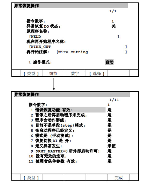 示教器上的STEP(單步)LED,顯示原程序的單步狀態(tài)。因此,在再啟動程序暫停中,按下STEP“單步”鍵,即使 STEP LED點(diǎn)亮,異常恢復(fù)DO依然保持接通狀態(tài)。這是因?yàn)長 E D表示原程序處于單步狀態(tài),再啟動程序不是單步之故。
